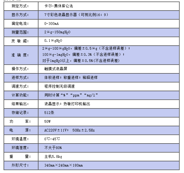 儀器符合GB/T7600及采用卡爾—費休法測定樣品中水分的有關標準, 是淄博庫侖分析儀器有限公司經過幾代庫侖法微量水分測定儀的完善和改進,生產出的全新的具有人機對話功能新一代水分測定儀器。 該儀器采用雙CPU控制,測量精度、運算功能大幅度提高,同時,大屏幕彩色液晶顯示、觸摸屏控制、中文菜單,具有電極開路、短路報警等故障自檢功能,可儲存512條信息,自動計算并打印PPm、%、mg/L的測定結果。該儀器獲得三項國家專利。